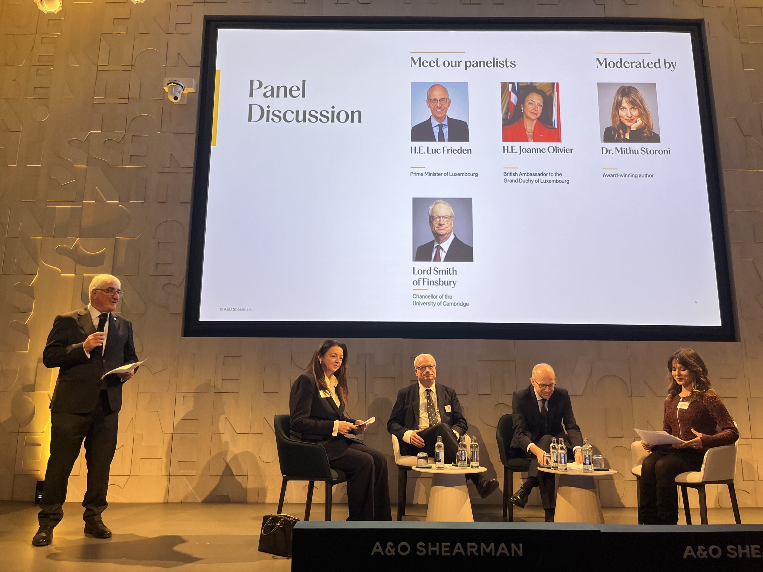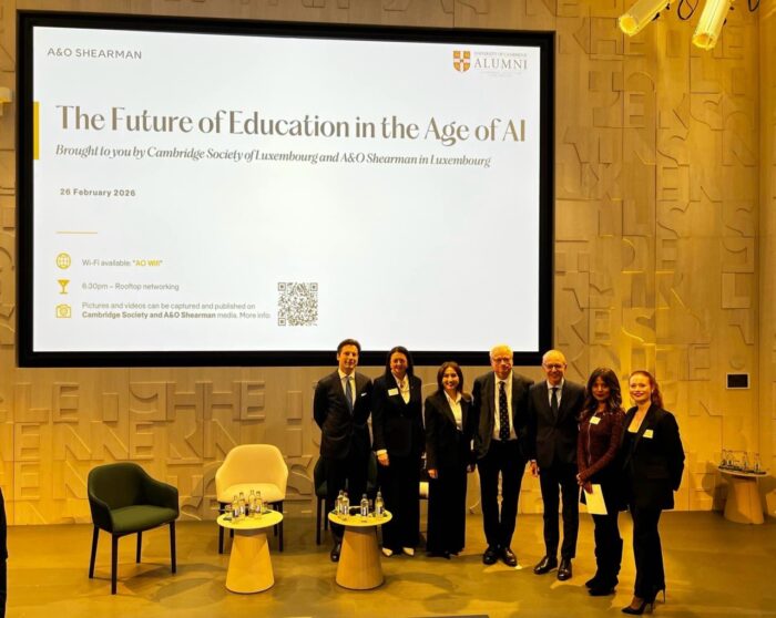 First, on 26 February the Chancellor took part in a highly distinguished panel discussion with Luc Frieden, the Prime Minister of Luxembourg and a Cambridge alumnus, and Joanne Olivier, the British Ambassador to Luxembourg on the highly topical and challenging subject of “The Future of Education in the Age of A.I.” This was co-organised and sponsored by A&O Shearman in their magnificent premises on the Kirchberg. The panel discussion was expertly moderated by our Committee member Dr. Mithu Storoni, the author of “Hyperefficient”, the 2025 Business Book of the Year. The audience of 130 persons , made up of members of the Cambridge Society and clients of A&O Shearman, a range of members of other Societies, educationalists, and other interested parties, filled the auditorium.
