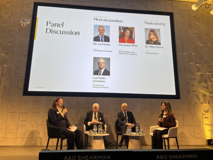 In addition to thanking our distinguished panelists, and our sponsors A&O Shearman, special mention must also be made of Justine Yansenne and Emel Tulun who are members of the Cambridge Society and who also work at A&O Shearman. They persuaded A&O Shearman to sponsor and co-organise the event with the Society, and then played a major role, together with Mithu Storoni in preparing the panel discussion. Their contribution was key to the success of the event.
